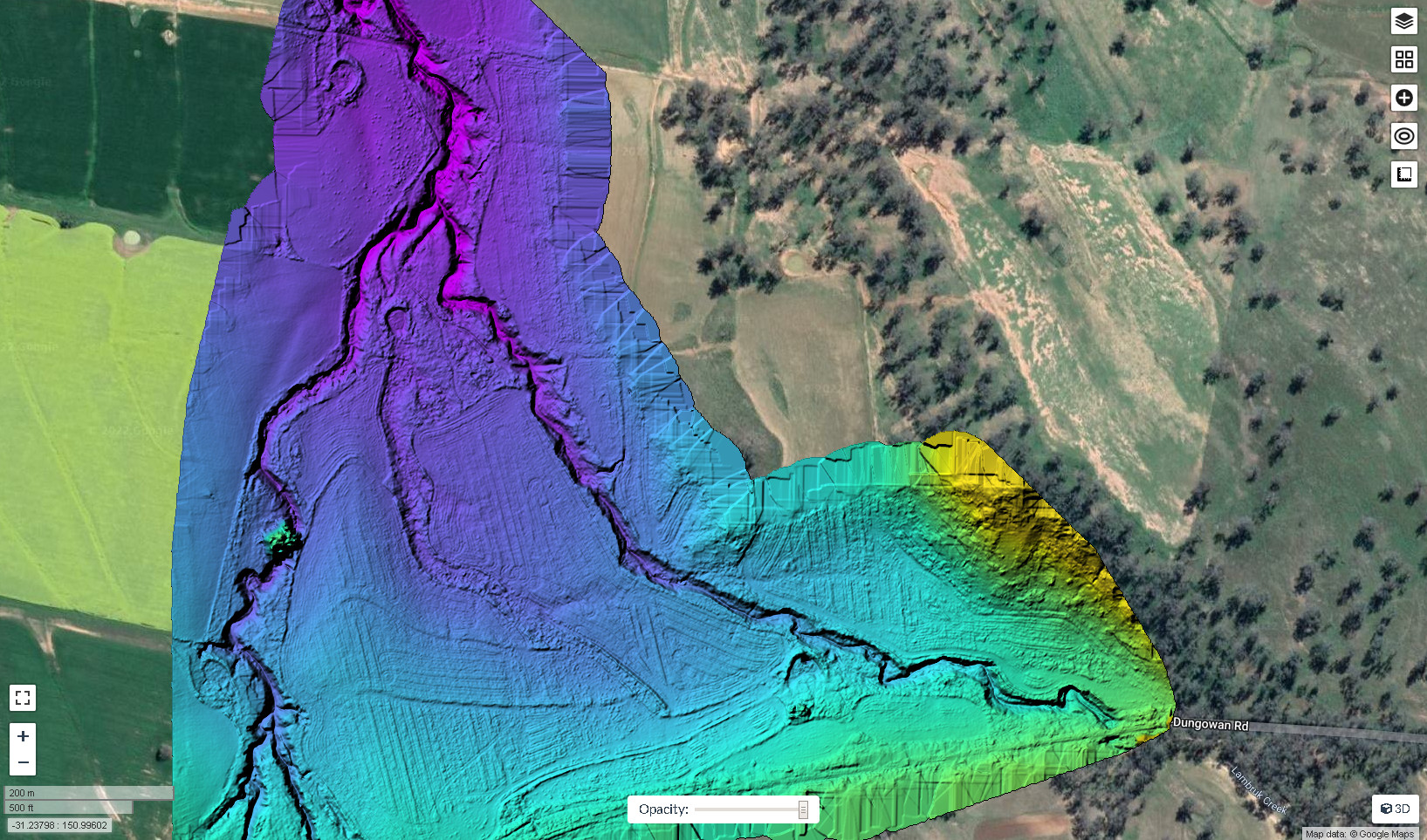 A slump occurred at Dungowan on 30/9/2022, the new geography shown here as a digital terrain model